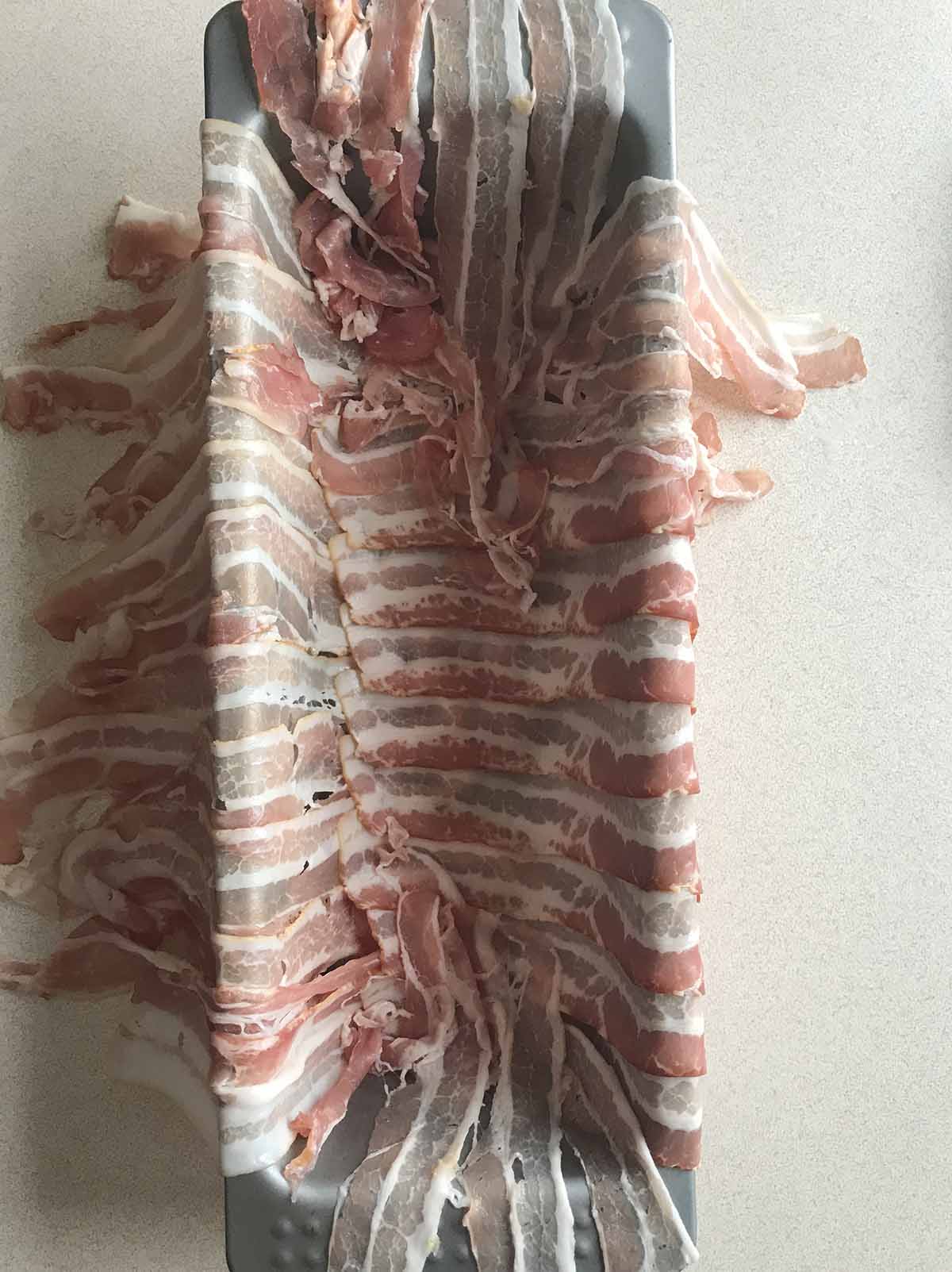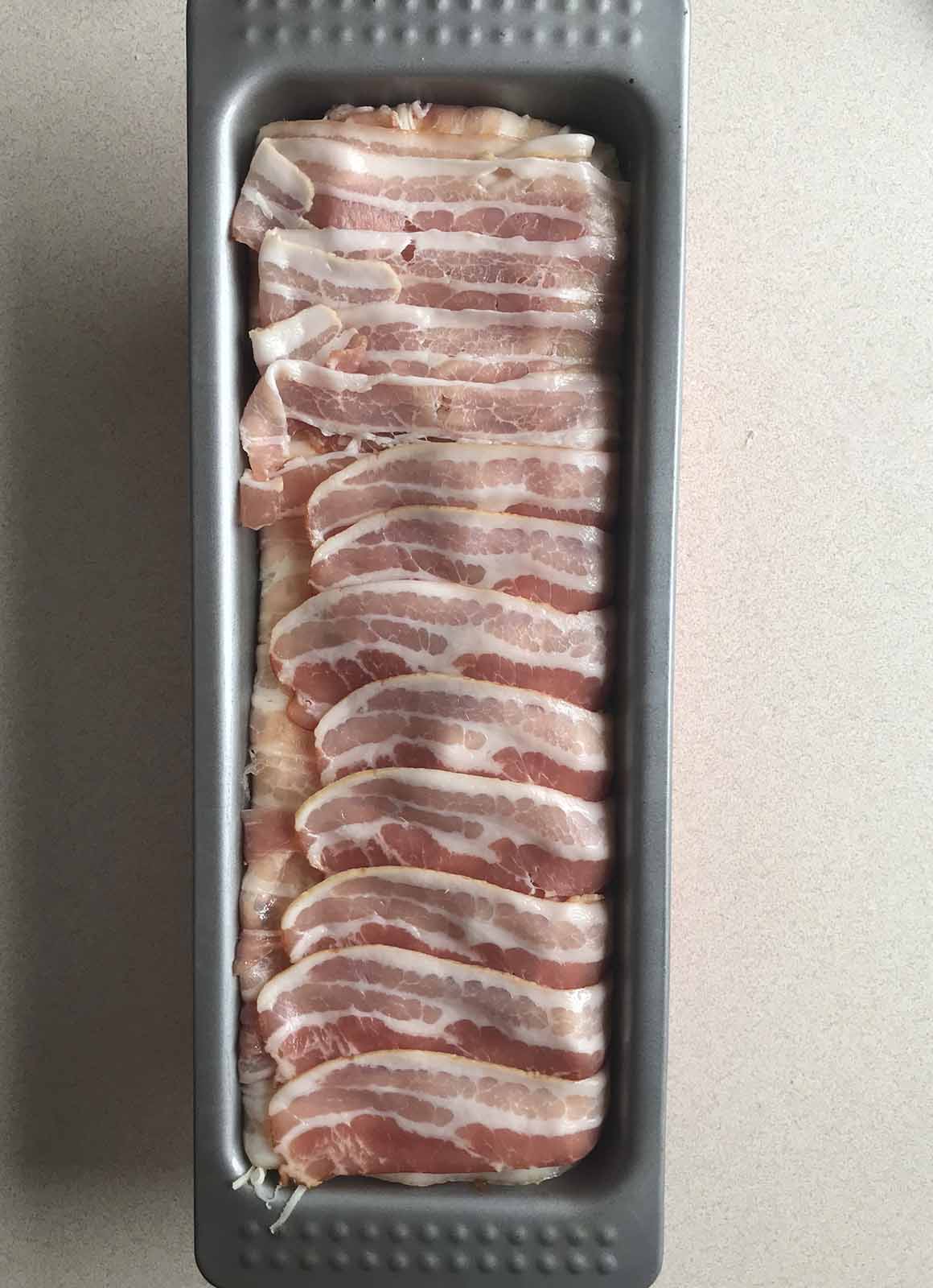 - Arrange the bacon in the loaf tin (as pictured) and preheat the oven to 180 °C.