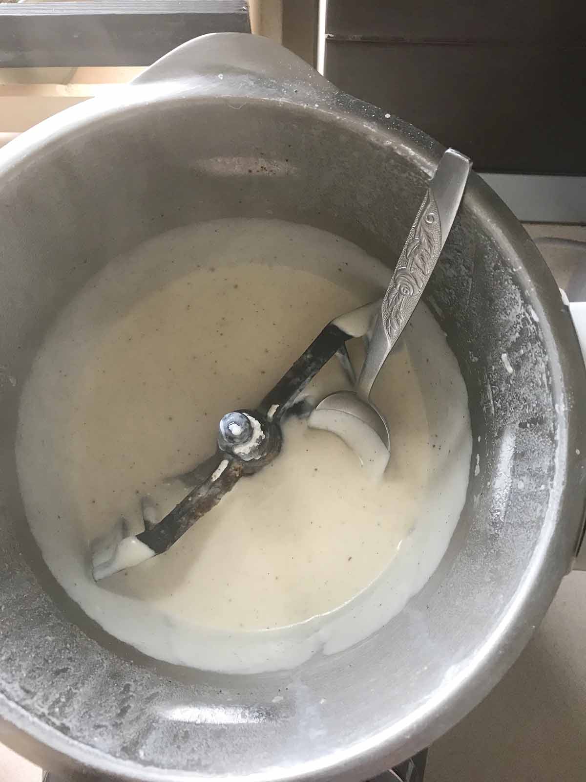 - Do misy wyposażonej w trzepaczkę umieść mąkę i mleko, dopraw solą, pieprzem i gałką muszkatołową i wymieszaj przy prędkości 7 przez 1 minutę. Następnie dodaj masło i uruchom program sauce przy prędkości 4, temp. 90 oC na 8 minut.