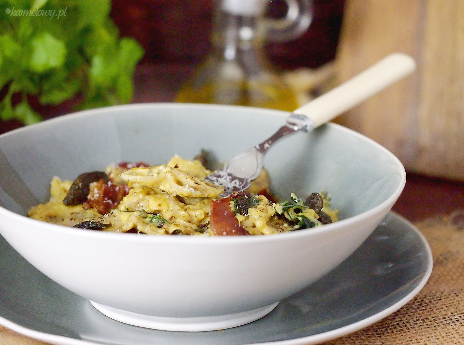 Makaron w sosie dyniowym z kozim serem i jarmużem